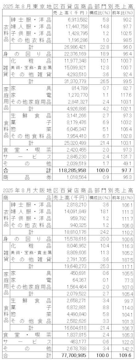 商品別では、主要5品目のうち家庭用品と食品がプラスとなった。 細分類では、子供服・洋品、美術・宝飾・貴金属は7カ月ぶりにプラスとなったほか、 化粧品は4カ月ぶり、菓子、惣菜は14カ月ぶりにプラスとなった。紳士服・洋品、 婦人服・洋品は7カ月連続、生鮮食品は17カ月連続でマイナスとなった。