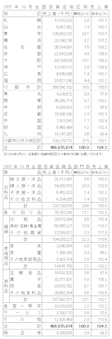 日本百貨店協会が調査した全国百貨店(70社・176店)の10月売上高は4668億円余、前年比(店舗調整後)は4.3%増で3カ月連続でプラスとなった。入店客数も2.2%増と2カ月ぶりにプラスに転換した。インバウンドの売上げが7.5%増と8カ月ぶりにプラスとなったほか、国内売上げも好調だった。下旬以降の気温低下に伴い秋冬物衣料品が好調に推移したことに加え、化粧品や時計・宝飾などの高額品を含む雑貨と身の回り品が伸長し、全体を押し上げた。