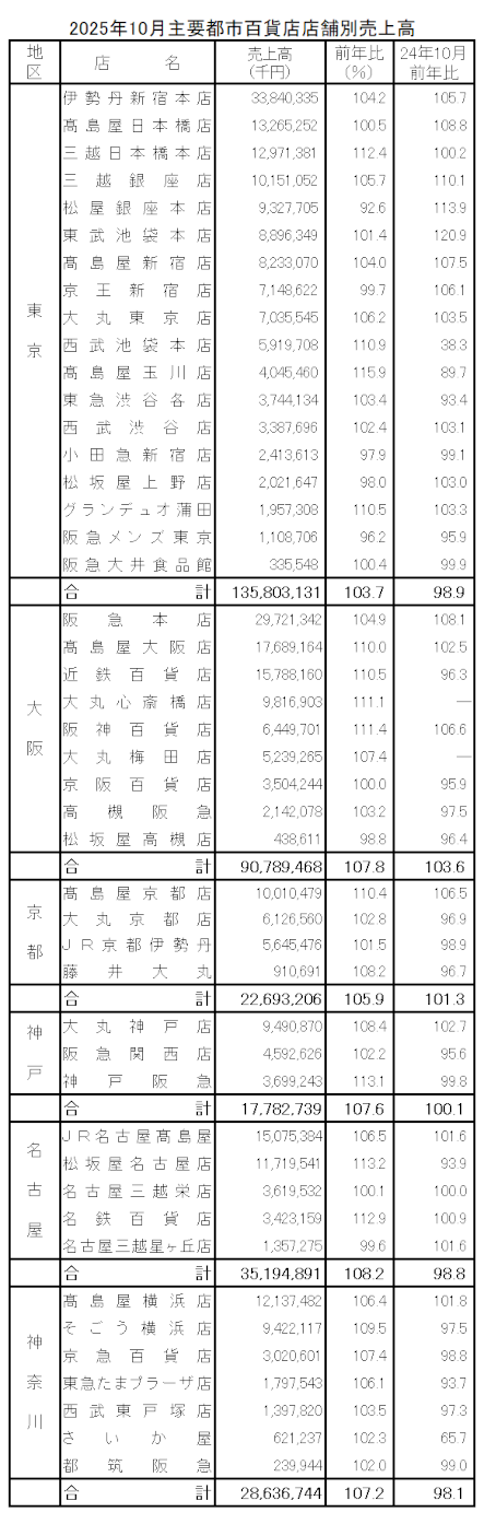 商品別では、主要5品目すべてがプラスだった。主力の衣料品は、前半は高気温で秋冬物衣料品が苦戦したが、後半はセーターやコートなどのアウターが稼働した。身の回り品はインバウンドや外商顧客など、国内外共に好調で9カ月ぶりにプラスに転換した。化粧品はインバウンドで国内ブランドの複数買いなどが見受けられたほか、国内もスキンケア商品などが好調だった。食品は価格高騰の影響で生鮮食品はマイナスだったが、菓子は国内外の手土産といったギフト需要が伸長し、秋の味覚を取り揃えた物産展などの食品催事が集客に寄与した。おせちはウェブを中心に早期受注がスタートし、堅調な滑り出しとなった。