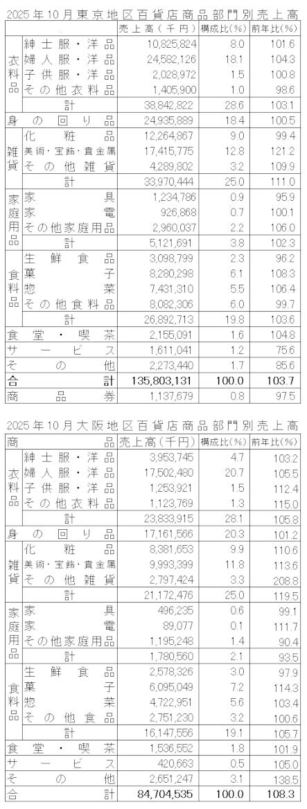 雑貨(11.0%増)は、化粧品で一部ブランドの価格改定前の駆け込みが見られたほか、スキンケア商品やホリデー限定商品など、国内外共に好調に推移したが、改装工事の影響などもあり、0.6%減と僅かに前年に届かなかった。美術・宝飾・貴金属は好調に推移し、2か月連続で2桁増となった。