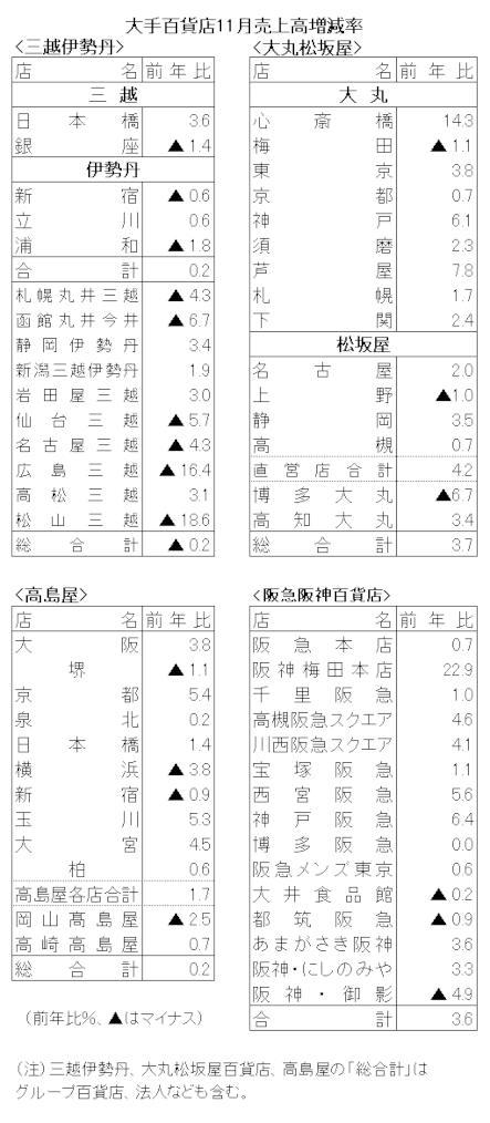 大手百貨店4社の11月売上高は、大丸松坂屋百貨店が3.7%増、阪急阪神百貨店が3.6%増、高島屋が0.2%増と3社が4カ月連続で増収となった。三越伊勢丹は0.2%減と減収に転じた。免税売上げは大丸松坂屋百貨店が13.3%増、高島屋が3.1%減だった。国内顧客は気温の低下に伴い、各社で冬物衣料に動きが見られた。