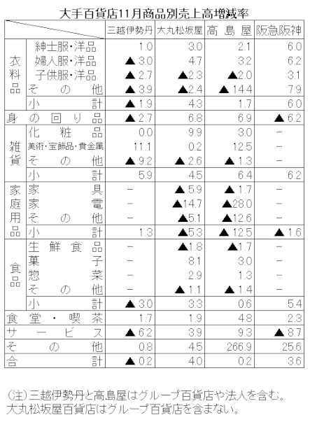 主要5品目は、身の回り品(6.8%増)、雑貨(4.5%増)、衣料品(4.3%増)、食品(3.3%増)がプラスとなり、家庭用品(5.3%減)がマイナスだった。品目別では婦人服・洋品(4.7%増)が平年に比べ気温が低くかったことから冬物衣料品が動き、ラグジュアリーブランドも好調を持続し前年を上回った。紳士服・洋品(3.0%増)は、コートやブルゾンなどの防寒衣料品が動いたことなどからプラスとなった。身の回り品(6.8%増)は、訪日外国人客数の増加に伴い、アクセサリーやハンドバッグなどが好調に推移した。雑貨(4.5%増)は、化粧品がけん引したほか、外商顧客向け催事で宝飾品が好調だったことにより、前年を上回った。食品(3.3%増)は歳暮ギフト需要により、菓子が大きく売上げを伸ばした。