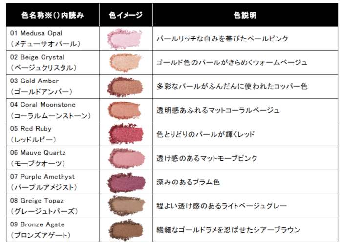 カラーは「メデューサオパール」「ベージュクリスタル」「ゴールドアンバー」「コーラルムーンストーン」「レッドルビー」「モーブクオーツ」「パープルアメジスト」「グレージュトパーズ」「ブロンズアゲート」の全9種類で、天然石からインスピレーションを得た。