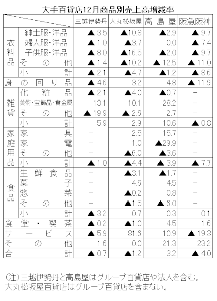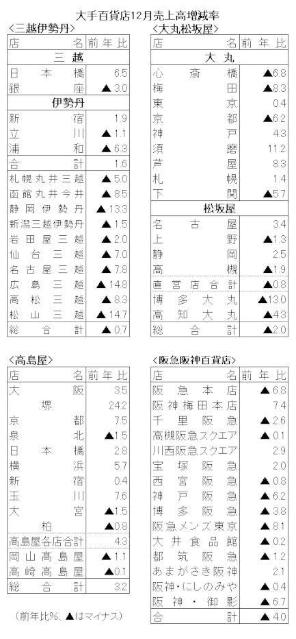 大手百貨店4社の12月売上高は、高島屋が3.2%増、阪急阪神百貨店が4.0%減、大丸松坂屋百貨店が2.0%減、三越伊勢丹が0.7%減だった。免税売上げは大丸松坂屋百貨店が16.8%減、高島屋が11.1%減とどちらも減収だった。各社ともに、シーズン需要で美術・宝飾・貴金属が堅調に推移した。