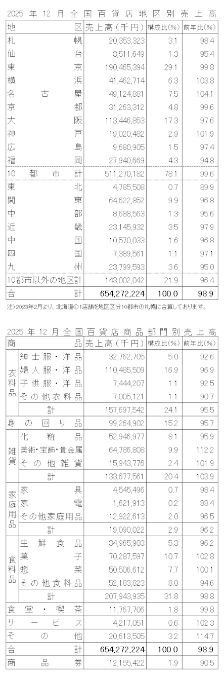 商品別では、主要5品目のうち、雑貨のみプラスだった。衣料品は、平年に比べ気温が高く、冬物重衣料の動きは鈍かったが、ニットなど今着られるアイテムは好調だった。時計は一部ブランドで価格改定前の駆け込みが見られた。アクセサリーはシーズン需要もあり好調だった。食品は価格高騰により、生鮮食品は低調だったが、菓子や惣菜は好調に推移した。