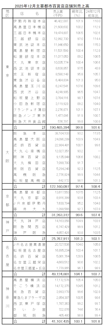 インバウンドを除いた国内市場は0.6%増(シェア92.1%)と5カ月連続でプラスだった。10都市は、札幌、東京、横浜、名古屋、京都、大阪、神戸の7地区がプラスとなり、1.9%増と5カ月連続でプラスだった。10都市以外の7地区は、衣料品が振るわず全地区がマイナス。計3.5%減となり、苦戦した。