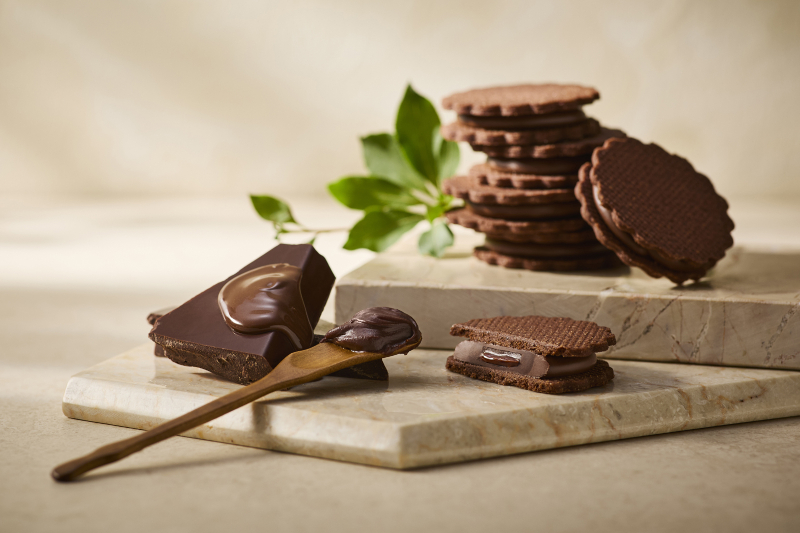 ココアクッキーは、パリッと軽やかな歯切れと、サクッとほどける口当たりが特長。厚み、レシピ、焼き時間を細やかに調整し、サンドされたチョコレートの濃厚さを引き立てるバランスに仕立てた。