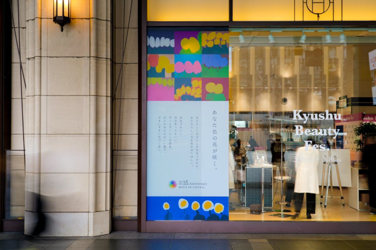 博多阪急は15周年のストアメッセージを「FUN BLOOM(楽しさが、街を咲かせる)」とする。新しい価値を生む場所として、福井氏の作品を“視点を変えるレンズ”として、両社は“これまでの感謝とこれからの期待” を込めたメッセージを発信していく。
