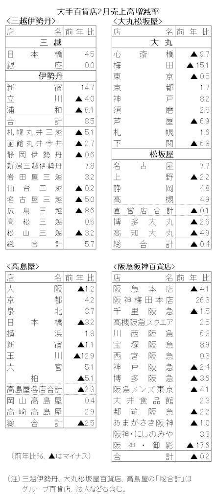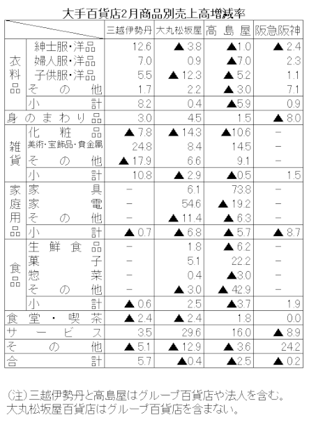 主要5品目は、身の回り品(4.5%増)、食品(2.5%増)、衣料品(0.4%増)がプラスとなり、家庭用品(6.8%減)、雑貨(2.9%減)がマイナスだった。品目別では、婦人服・洋品(0.9%増)は、梅田店の大型改装に伴う売場面積縮小による影響があったものの、外商顧客向け催事の好調などによりラグジュアリーブランドが売上げを伸ばしたほか、気温上昇に伴い春物衣料品が動いたことなどからプラスとなった。紳士服・洋品(3.8%減)は、ブルゾンなどの春物衣料品が動き始めたものの、梅田店の大型改装に伴う売場面積縮小による影響が大きく、前年を下回った。身の回り品は、婦人靴やハンドバッグが好調に推移した。雑貨は、外商売上げの好調により美術・宝飾品が売上げを伸ばしたものの、訪日外国人の減少により化粧品が前年を下回ったことなどから、全体でもマイナスとなった。食品は、バレンタイン商戦が好調に推移し、菓子が大きく売上げを伸ばした。