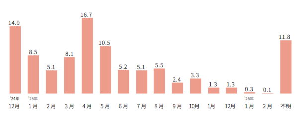一方、メーカーによる情報発信や、消費者が検討を始める時期はさらに早まっている。メーカーによるカタログの配布や展示会、ショールームの展開は1~2月にスタート。同会の調査によると、26年入学の子供がいる家庭の検討開始時期は、4月がもっとも高く、次点が前年12月だった(下図)。比較検討に時間を掛ける家庭が増えているのが見て取れる。