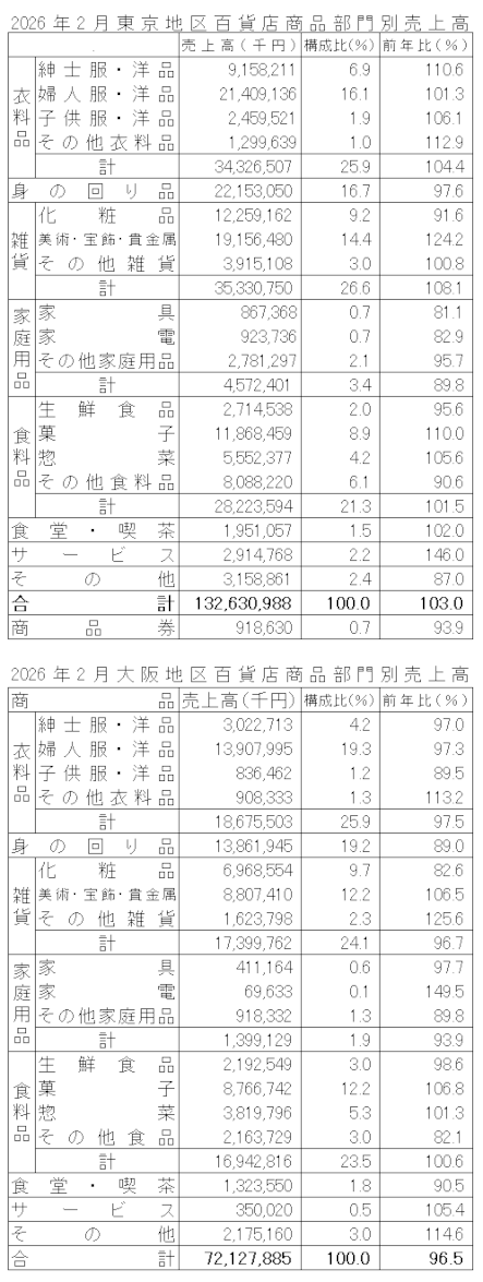 2026年2月 東京・大阪地区百貨店売上高
