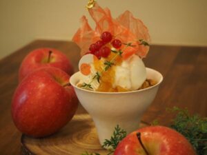 ミシュラン三ツ星<L’Effervescence>でシェフパティシエを務めた青木渚氏がレシピ開発を手がけるアイスクリーム専門店。サイズや形が理由で規格外となった素材を活用し、レストランパティシエならではの独自の組み合わせと味わいを実現しています。今回は、<ぺろちゃんクレープ>とナチュラルワイン専門店<エスポアしんかわ>とのトリプルコラボ。アイスクリームは3種類の中から選び、焼きたてクレープとそれぞれに合うワインを楽しめます。