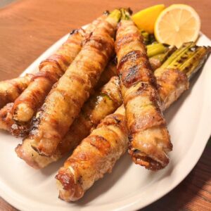 イタリア語で「Mangia e bevi!(食え、そして飲め!)」という意味を表す「マンジャエベーヴィ」は、ねぎに豚肉を巻いて豪快に焼きあげたシチリア・パレルモ名物。鹿児島県産黒豚のバラ肉を使い、ジューシーかつ旨みたっぷりに仕上げています。