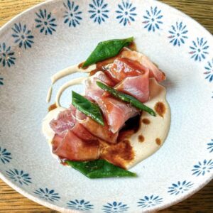 新鮮な魚介の味わいを大切にするティツィアーナ氏らしい、素材の鮮度を活かしたカルパッチョ。日本全国からその日に獲れた魚を厳選し、適切な処理と適度な寝かせでそのまま食べてもおいしさが伝わる状態に。アーモンドを使ったアフォブランコや仔牛の出汁(フォンドボー)など、素材の魅力とオリジナリティを兼ね備えた<アヤモーラ>らしいひと皿です。