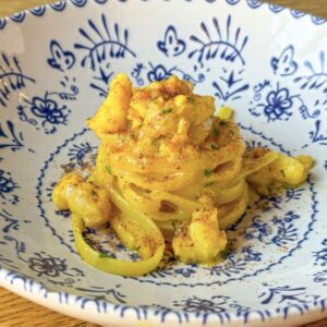 ティツィアーナ氏のシグネチャーでもある、魚介を余すところなく使ったひと皿。骨から出汁をとり、身は具材として、内臓はソースに溶かし込んで仕上げます。魚介の旨みにサフランの香りが加わり、シチリアらしく、シェフらしい味わいに、今展のためにシチリアから輸入したテヌーテコスタ社のパスタを使い、現地の味わいを再現します。