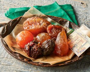 果物に小さな穴を開け、6時間毎に糖度の違う砂糖水に漬け1週間かけて仕上げる看板商品。凝縮された果物の香りと旨みが楽しめ、細かく切って紅茶やグラッパと一緒にどうぞ。
