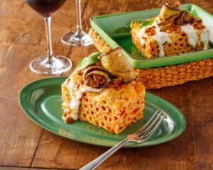 茄子とトマトのボロネーゼのパスタを焼きあげて固めたシチリアの郷土料理。断面の美しさも“ブォーノ”!