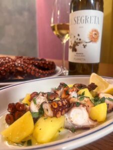 茹でたタコをシンプルにオリーブオイルとレモンで味わう定番メニュー。シチリアのワインとの相性抜群!