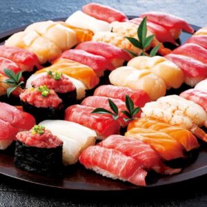 ●新登場『カネトモ』団らん寿司セット(45貫)(本マグロ中トロスライス、本マグロ赤身スライス/マルタ・スペイン産、メバチマグロとろみ/韓国産、イカスライス、ホタテ貝柱/国産、サーモンスライス/オーストラリア産各100g、赤エビ開き60g /アルゼンチン産、シャリ玉900g、すりおろし沢わさび25g)1万円 冷凍・送料込 ※賞味期間 冷凍7日