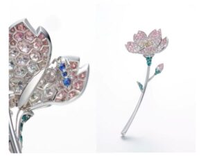 桜ブローチ(18K/Pt ピンクダイヤモンド、ダイヤモンド、ガーネット、サファイア)