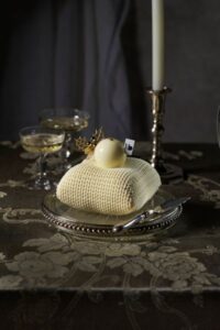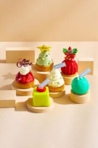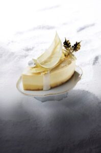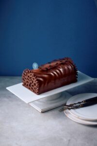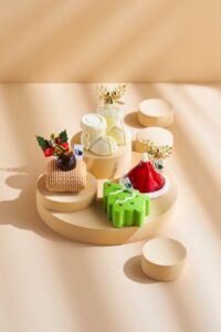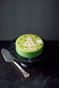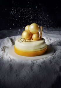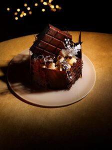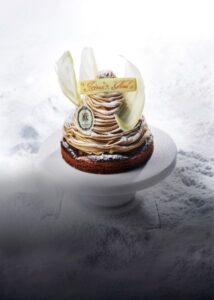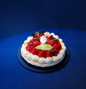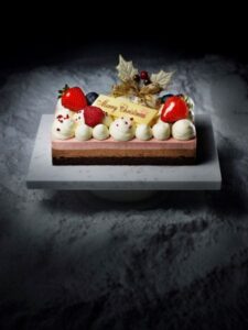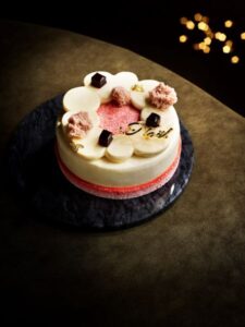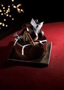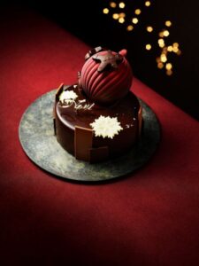 クリスマスマーケットを彩るオーナメントと満天の星空をイメージした、チョコレート飾りが印象的で、街中に漂うお菓子のスパイスの香りを、チョコレートムースに移したクローブやジュニパーベリーなどの香りで表現し、中にしのばせたベリーのコンフィの赤、バニラシャンティの白、ピスタチオクリームの緑で、クリスマスカラーを演出しました 。