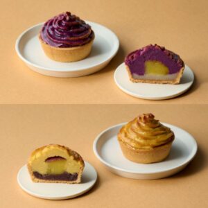 「氷とお芋の専門店 らんらん」あんぽてタルト(黄金・紫)(1個)各584円 スイートポテトと「中村製餡所」の粒あんがコラボ。【阪急うめだ本店初登場】