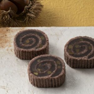 こしあんと熊本県産の栗ペーストを合わせた羊羹に、熊本県産のきざみ栗を入れて村雨で巻きあげた、栗をしっかり味わえる『京観世』です。