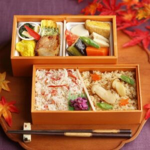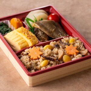 キノコの炊込み御飯と季節の焼き魚、だしまきたまごなどが入った秋ならではの新作お弁当です。