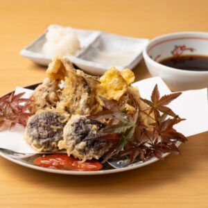 秋の味覚きのこを寿々天自慢の米油であげた天ぷら盛り合わせ。