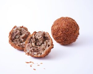 吉祥寺で行列必至の名物「元祖丸メンチカツ」。サクサクの衣の中からジューシーな肉汁がじゅわっとあふれだす、さとうの看板商品です。
