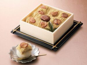 岐阜県の名産「栗きんとん」を使用した、和洋折衷の逸品デザートです。和栗とクリームを組み合わせて求肥で包んだ大福の上に、岐阜栗で作った栗きんとんを糸状にしてたっぷりしぼりました。自然な甘みがふんわりと広がる上品な味わいです。