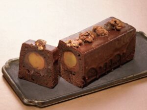 本みりんとラム酒でマリネした大粒の渋皮栗と、カカオ70%のフルーティーな酸味・苦味が特徴的なエクアドル産チョコレートのパウンド生地をしっとりと焼き上げました。濃厚なチョコレートが栗の風味を引き立てる、リッチな味わいのパウンドケーキです。