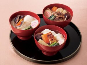 正月三が日に、毎日趣向が異なる美味が楽しめるお雑煮。東京・荒木町の日本料理の銘店<鈴なり>の村田シェフが監修しています。赤出汁は石野味噌とまるやの赤味噌×黒毛和牛、白出汁は山利の白味噌×クエ、すまし汁は浅沼醤油×鰻で仕立てました。