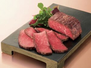 上質で名高い神戸ビーフの中でも、肉質に優れた牝牛だけを使ったローストビーフです。数々の品評会で優秀な成績を収める但馬牛肥育農家<川岸畜産>が手塩にかけて育てた神戸ビーフで、脂の旨みと濃厚な味わいを誇る牝牛のモモ肉を、低温でじっくりと焼き上げました。