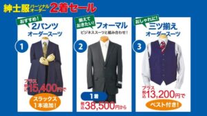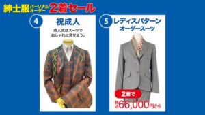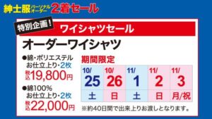 さらに、スーツ2着オーダーのお客様にはネクタイ1本をプレゼント(無くなり次第終了)。