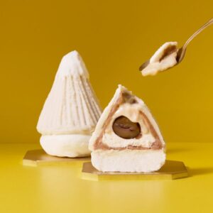 (上)飲めそうなほどとろとろの和栗ソースを閉じ込めた、真っ白なモンブラン。THE珀山モンブラン(2個入)1890円※要冷蔵、販売時間10:00~、17:00~、(下)とろける生食感の、マロンリッチな一口サイズの焼モンブランです。THEモンブランケーキ(8個入) 2376円