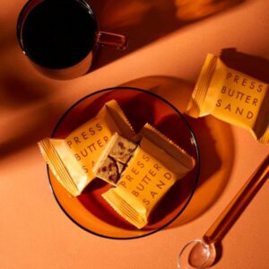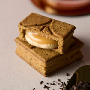 〈PRESS BUTTER SAND〉全国販売前に、先駆けて先行販売。和紅茶とベルガモットオイルを練り込んだアールグレイクッキーは、噛むたびにふわっと広がる華やかな香り。そこに、濃厚でコク深い練乳バターキャラメルがとろけ、まるでミルクティーのようなやさしい甘さが広がります。さらに、バタークリームにも和紅茶とベルガモットオイルを加え、紅茶の芳醇な風味とバターの濃厚なコクが重なり合う一口に。寒い季節に寄り添う癒しの味わい。華やかな香りで贅沢なひと時を感じられるバターサンドは、冬のギフトにも最適です。香り高く、奥行きのある味わいをご褒美タイムにぜひじっくりご堪能ください。