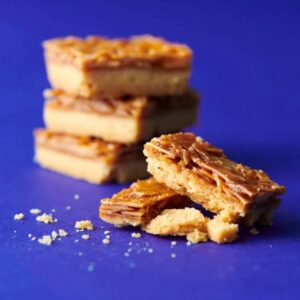 北海道産のバターを使ったサクサク食感のクッキー生地に、アーモンドを混ぜ込んだキャラメルを重ねています。キャラメルには柑橘をアクセントに効かせ、アーモンドとキャラメルの芳醇な香りとコクを引き立てます。