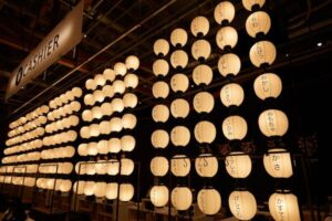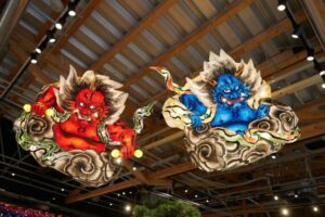 2025大阪・関西万博会場内オフィシャルストア東ゲート店では、大丸と松坂屋が創業した江戸時代に焦点を当て、「元禄時代の大店(おおたな)/EXPO2025 Ver.」をストアコンセプトに掲げ、館内には、風神・雷神をモチーフにしたねぶた装飾や提灯ウォールなど、日本の美意識と伝統を表現したデザインを取り入れました。大阪・関西ならではのユーモアを散りばめ、訪れる多くの国内外のお客様に独特の空間演出をお楽しみいただきました。その1部が、大丸梅田店の5階の大阪・関西万博オフィシャルストアにやってきます。