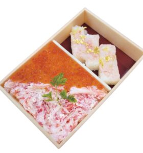 甘えびの押し寿司と、かにといくらも楽しめる豪華な一折。