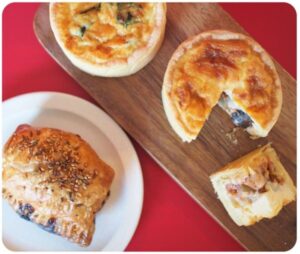 「メルローズアンドモーガン」ソーセージロール(1個)540円、ナス&チョリソーのキッシュ(1個)670円、サーモン&ほうれん草のキッシュ(1個)735円