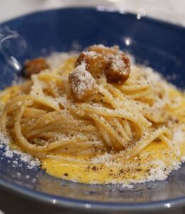 岩堀シェフがローマでの修行時代に毎日100食以上作り続けたローマ伝統のカルボナーラ。じっくりソテーをしてカリカリに仕上げたグアンチャーレを使い、生クリームは不使用。本場と同じレシピで仕上げられています。