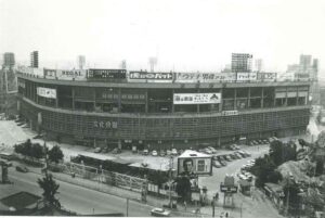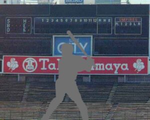 大阪スタヂアムを背景に、ユニフォームやバットを使って写真撮影をしよう。
