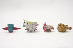 左から 酒井智也「ReCollection Cup」、AOI「チクッと杯×ectoplasm」、水元かよこ「一角獣」、森聖華「しっぽり飴釉河豚ぐい呑」