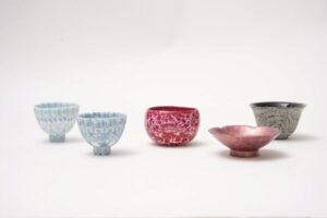 左から 金田萌永「透光練込ぐい呑」、金田萌永「透光練込ぐい呑」、増原嘉央理「らぴす 牡丹ぐい呑」、増原嘉央理「綺光彩輪花酒盃 花筏」、増原嘉央理「girar ぐい呑」