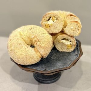 パティシエールの知識と技術をいかして完成させたオリジナルベーグル。生地に使う水分はすべてコーンピュレ。粒の食感とピュレの甘みが合わさり、噛んだ瞬間“コーン”を感じる一品。シンプルなのに満足感のあるベーグルです。