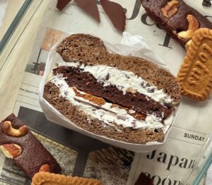 愛媛県・西条市のベーグルカフェ。パリッとした食感のハードベーグルの店です。チョコサンドはコーヒー生地に、マスカルポーネクリーム、自家製のチョコブラウニーをサンドしました。シナモンクッキーや、パキッとしたチョコもいれることで食感も楽しんでいただけます。
