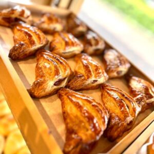 ワインに合うこだわりのパンとソムリエが厳選したワインが人気のベーカリー。国産りんごをソムリエが選び抜いた赤ワインで漬け込んだ大人のアップルパイ。りんごを赤ワインに漬ける一手間が味に深みを与えます。