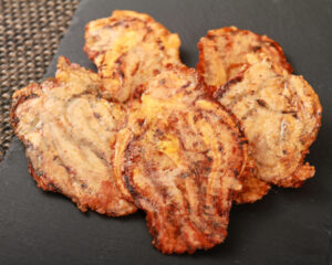 イカゲソにせんべい粉をまぶして鉄板ではさみ焼き。イカの旨味がギュッととじこめられています。