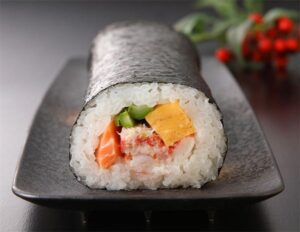 京都丹後・与謝野町産のお米を酢飯にし、紅ずわいがにやサーモントラウト、えびといった海鮮をたっぷり。自慢の具材を、歯切れと香りのよい国産海苔で巻いて。